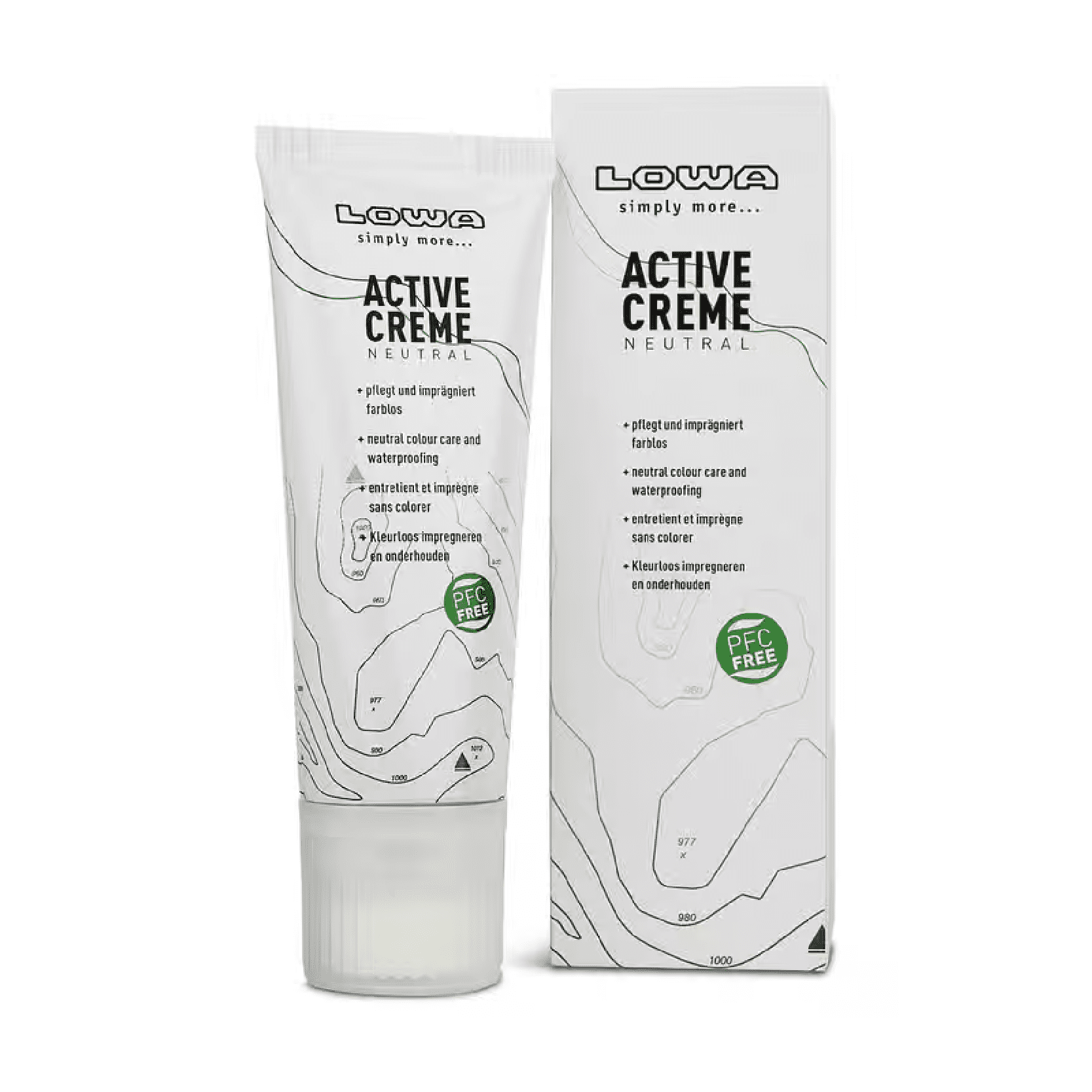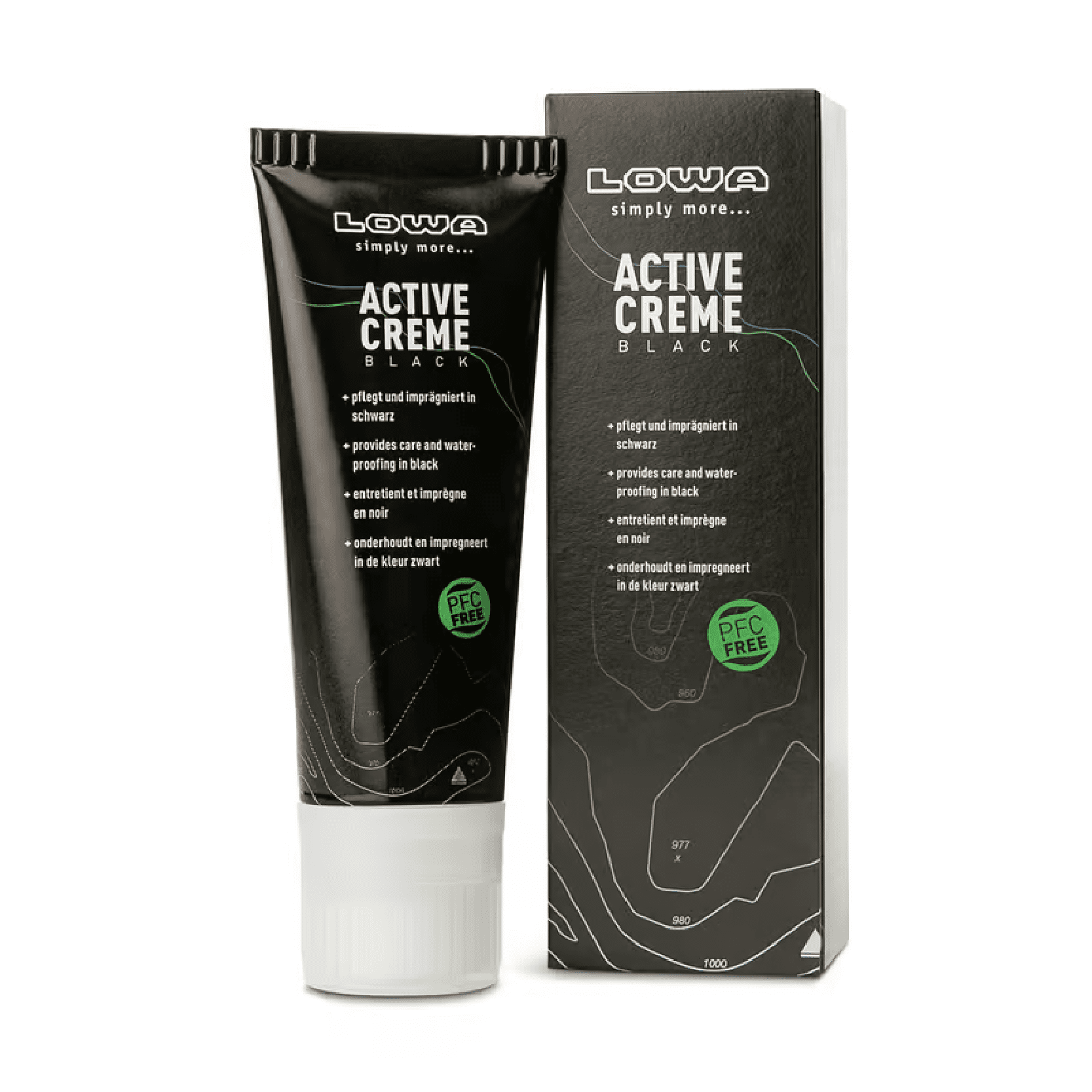 The new LOWA ACTIVE CREME NEUTRAL is the ideal colourless intensive wax care for all leisure, mountain and hiking boots. It keeps the leather permanently supple and, when used regularly, prevents the leather from drying out and becoming brittle. In combination with LOWA WATER STOP PRO, it provides the perfect protection for your LOWA shoes. And the best thing? LOWA ACTIVE CREME NEUTRAL is PFC-free. The new LOWA ACTIVE CREME BLACK is the ideal intensive wax care for all black LOWA smooth leather shoes from the task force and safety shoe sector. It keeps the leather permanently supple and, when used regularly, prevents the leather from drying out and becoming brittle. The cream also blackens the leather with every application – for a long-lasting black look. In combination with LOWA WATER STOP PRO, it provides the perfect protection for your LOWA shoes. And the best thing? LOWA ACTIVE CREME BLACK is PFC-free.