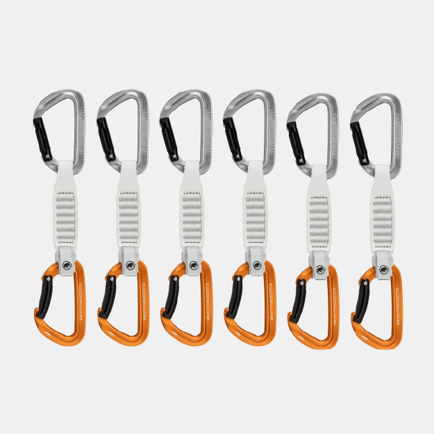 Mammut Sender Keylock 12 cm 6-Pack Quickdraws Sender quickdraws are designed for alpine climbing and high-performance sport. The combination of extremely light, compact carabiners and Dyneema® slings delivers an optimum balance of weight and performance. The straight gate with a ribbed grip area allows easier clipping, while the key lock system prevents snagging when clipping and unclipping. The sling varies in width and provides a firm grip; a robust sling protector keeps the lower carabiner in place and reduces wear. The bright orange indicator shows that the sling and protector are attached correctly to the carabiner. For users who need to save weight but still value ergonomics.