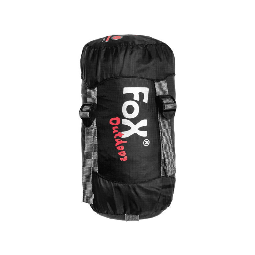 A lightweight sleeping bag from MFH Fox Outdoor in black. It is made entirely of durable polyester and is cut for a snug fit.