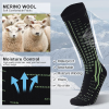 Merino wool inner layer are comfortable and skin friendily; Middle layer has 100% waterproof lightweight membrane, which doesn’t let the external water molecules enter the socks, but let misture out, make our socks waterproof and breathable; Out layer is durble and quickly drying.
