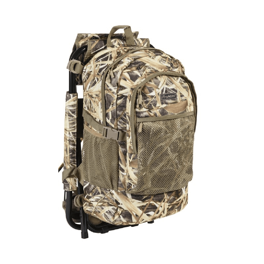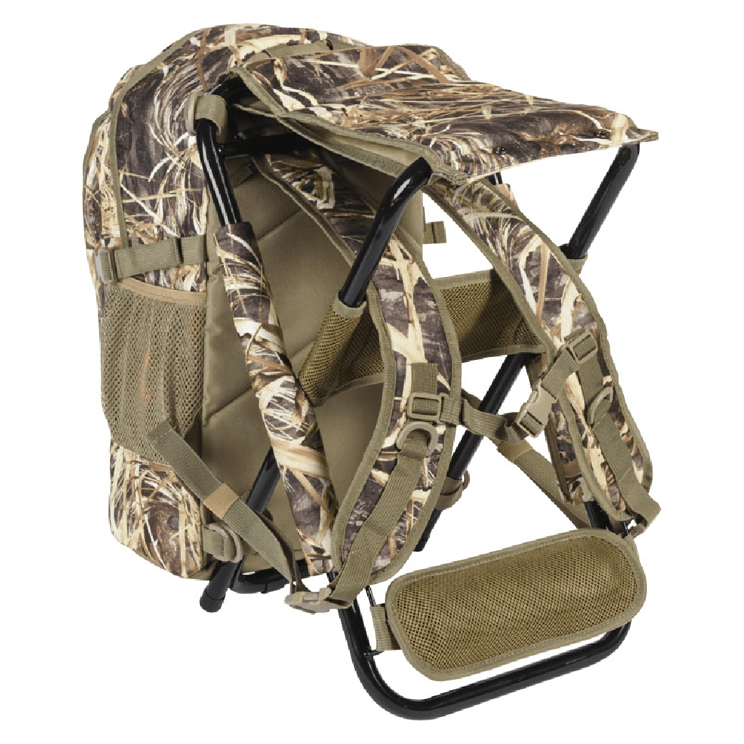 Water-repellent backpack with integrated seat, combining robustness and comfort. Padded seat, strap and back reinforcement for greater comfort, 2 large zipped pockets. 3 external mesh pockets, 2 internal mesh pockets. Seat height of 50 cm, weight of 2.4 kg. 22 x 29 x 46 cm Khaki – Camo forest Camo reeds